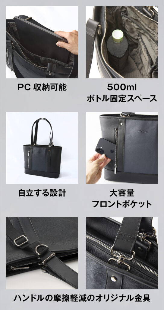 ビジネスバッグとして必要な収納力、リュックとしての動きやすさ、そしてトートとしての上質な佇まい。このバッグは、3つの役割を1つにまとめながら、「入れる・取り出す・持つ」をすべてスムーズにする設計にこだわりました。