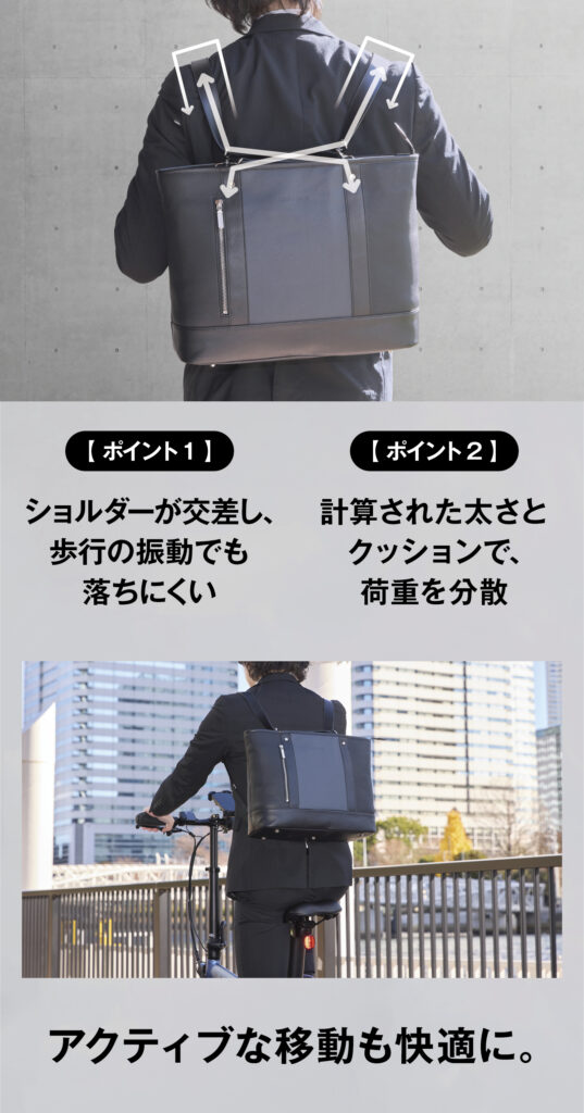 トートとして肩掛けする際は、ショルダーが肩から落ちにくく、リュックとして使用する際は、荷重が分散される設計です。